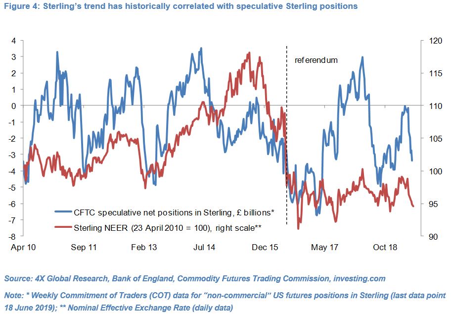 However, speculative short Sterling positions have since surged to £3.4bn (as of 18 June) and Sterling depreciated 4.8%. Markets are digesting the Brexit Party’s strong showing at the European Parliament elections on 24th May and the commitment by Boris Johnson, the front-runner to succeed Prime Minister May, to take the UK out of the EU by 31st October with or without a deal. Moreover, UK GDP growth likely slowed sharply in Q2 and we maintain our forecast that there is little chance of a policy rate hike any time soon.