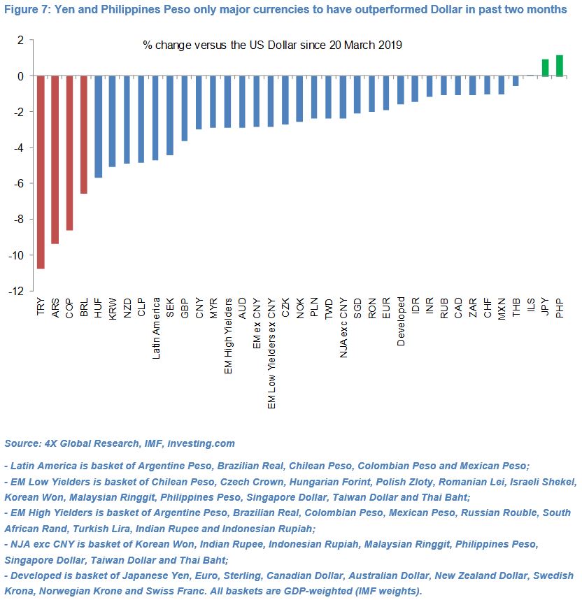 - Significant outperformance of the Indian Rupee, Russian Rouble, South African Rand and Mexican Peso not just against other risk-sensitive peers such as the Turkish Lira and other Latin American high-yielders but also most low-yielding emerging market (EM) currencies.