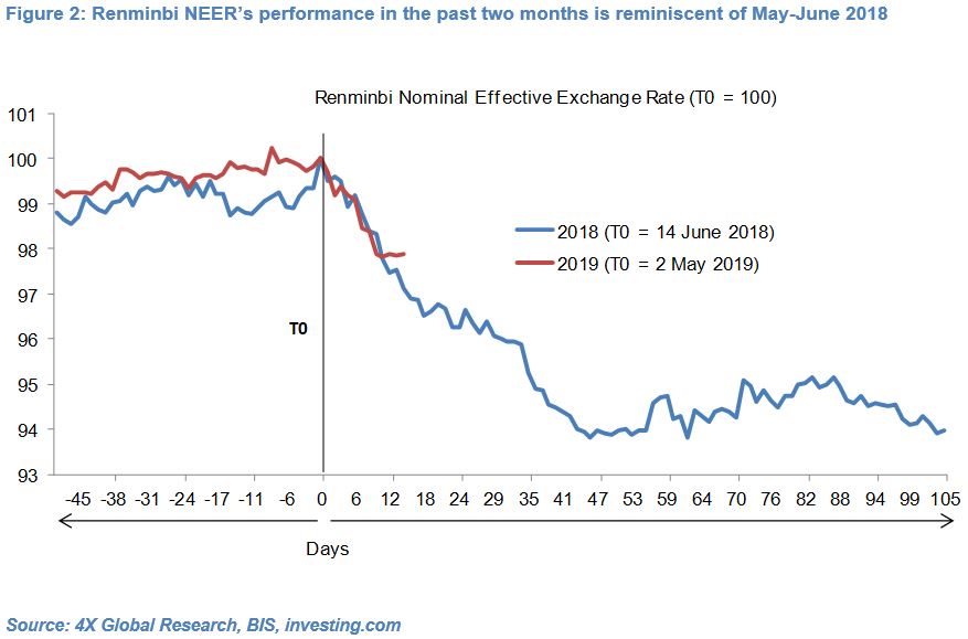 The Renminbi Nominal Effective Exchange Rate (NEER), which had appreciated 3.5% in the two months up to 5 March 2019 and then traded in a narrow 1% range in the following two months, has since 2 May depreciated 2.1% to its weakest level since 25th January.